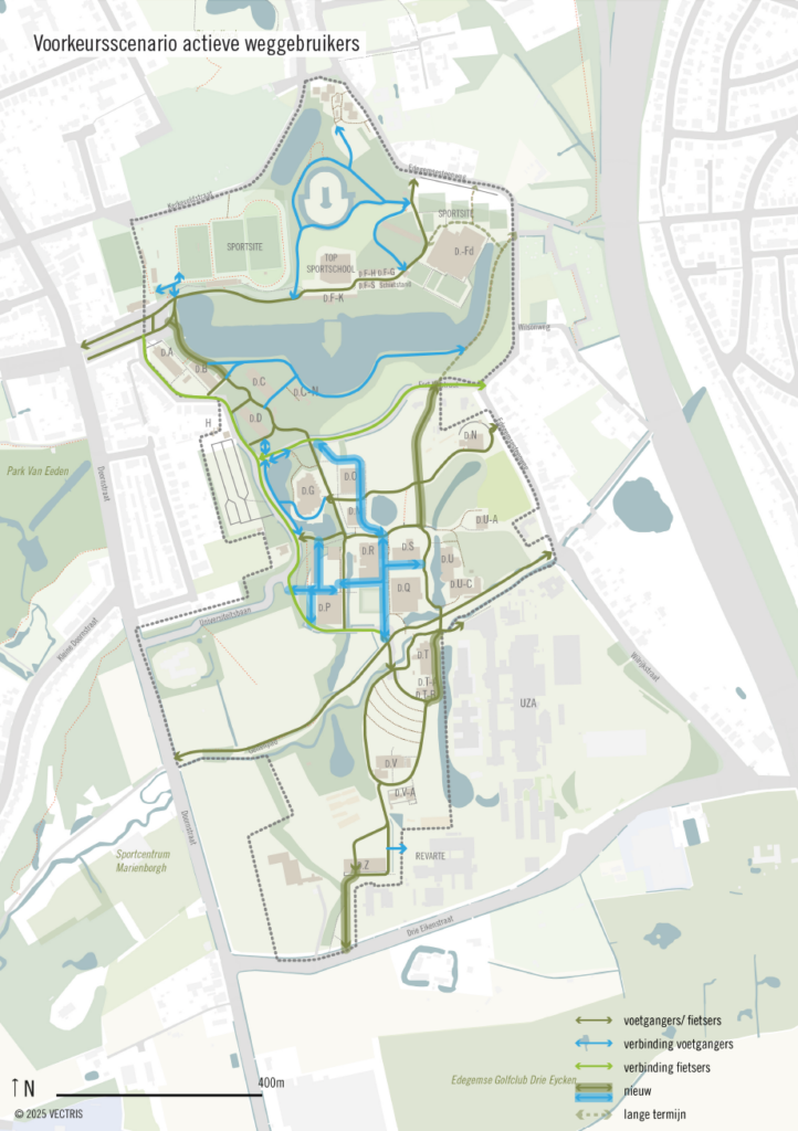 Vervolgens werden de toekomstplannen op de campus meegenomen om de toekomstige zwaartepunten te weten te komen en om de netwerken van de verschillende vervoersmodi op basis hiervan meer te verfijnen. Er werd gekeken naar een toekomstbestendige parkeervisie, versterken van de doorwaadbaarheid, ideale dimensioneringen, ondersteunende faciliteiten, …