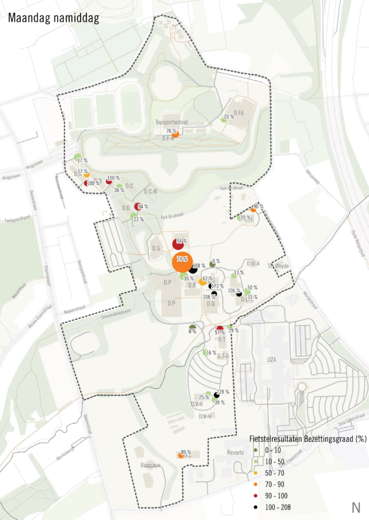 Bij de analyse werd de hele campus in detail bestudeerd. Zo werd het aanbod aan fiets- en autoparkings in beeld gebracht om vervolgens een parkeerdrukmeting uit te voeren. Zo werd een beeld gevormd van de minst en meest gebruikte fiets- en autoparkings en bijhorende ontsluiting. Daarnaast werden ook verkeerstellingen uitgevoerd aan de verschillende toegangen. Ten slotte werd ook in detail een beeld gevormd van het gebruik van de verschillende gebouwen op de campus.